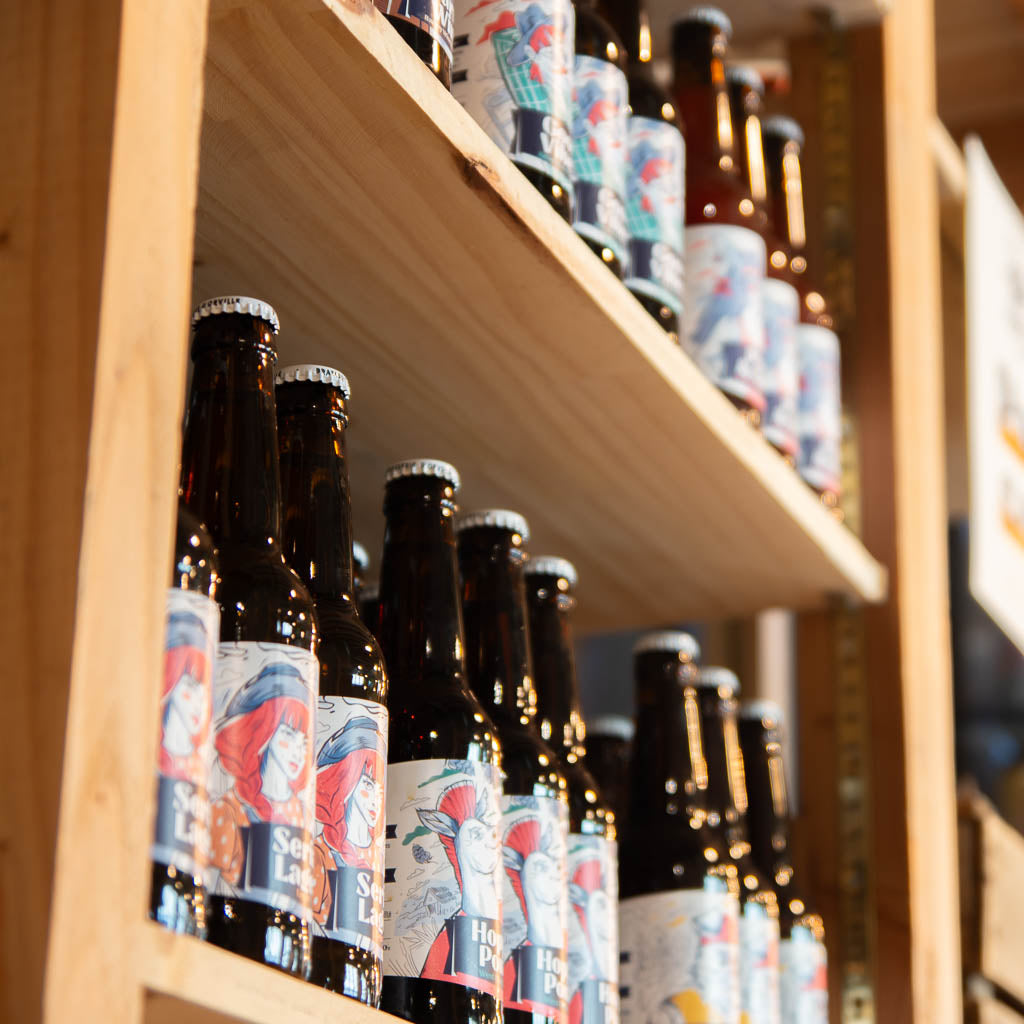 Ne repartez pas les mains vides ! Retrouvez toutes nos bières préférées en bouteilles de 33 cl ou canettes 44 cl dans notre boutique, parfaites pour vos apéros à la maison. Découvrez aussi nos packs cadeaux, verres et autres produits dérivés pour prolonger l’expérience chez vous ou faire plaisir à vos proches.