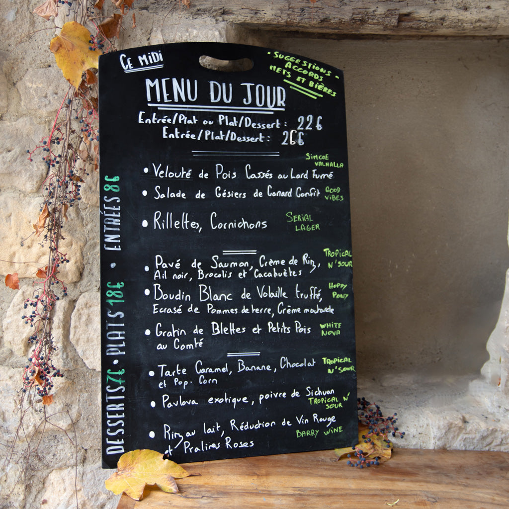 Chaque midi, laissez-vous tenter par notre ardoise, où plats et formules évoluent au rythme des saisons. Notre carte courte et soignée, composée de 3 entrées, 4 plats et 3 desserts, met à l’honneur la fraîcheur et la qualité de nos produits. Que vous soyez amateur de viande, de poisson ou adepte de cuisine végétarienne, vous trouverez forcément votre bonheur !